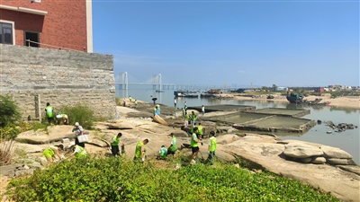 理论课程结束后,青年志愿者迅速行动,手持工具前往世界文化遗产点石湖码头(林銮渡)海域海边开展实践活动。只见志愿者沿着海岸线细致捡拾塑料瓶、包装袋等垃圾,分类打包后妥善处理。