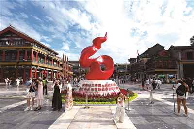 记者29日从北京市城市管理委员会了解到,围绕“铭记历史、缅怀先烈、珍爱和平、开创未来”主题,北京市综合运用国旗红旗、立体花坛、宣传画面、夜景照明等形式进行景观布置工作,以庄严隆重、恢宏大气的氛围纪念中国人民抗日战争暨世界反法西斯战争胜利80周年。图为8月29日,游客在前门大街北口“万众一心”雕塑前合影留念。(新华)