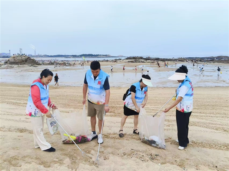 海滩上,大家身着统一马甲,手持垃圾袋和夹子,穿梭在沙滩的各个角落,仔细搜寻着藏匿在礁石缝隙、沙滩凹陷处的垃圾。无论是被潮水冲上岸的塑料瓶、包装袋,还是游客遗落的纸巾、烟头,都逃不过他们的“火眼金睛”。