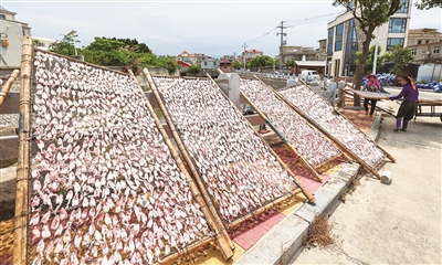 日前,记者在永宁镇梅林村看到,不少渔民正忙着晾晒鱿鱼。每年开渔后是鱿鱼捕捞旺季,鱿鱼通过传统晒制技艺加工成干货,既解决储存难题,又提升产品附加值。(记者 颜华杰)