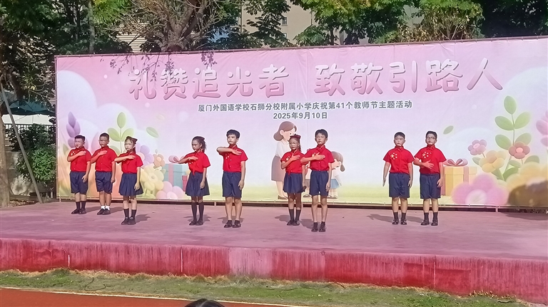 本报讯 今年9月10日是全国第41个教师节,厦门外国语学校石狮分校附属小学开展以“礼赞追光者 致敬引路人”为主题的2025年教师节主题活动,通过丰富多彩的形式,让学生在浓厚的节日氛围中表达对教师的感恩之情。