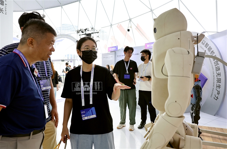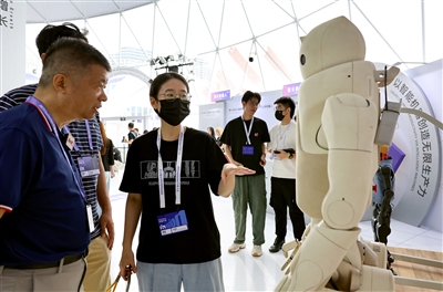 9月10日,工作人员(中)向参观者介绍一款具备触感反馈功能的人形机器人。9月10日至9月13日,2025Inclusion·外滩大会在上海黄浦世博园区举行。本届外滩大会除开幕主论坛、开放见解论坛和AI科创系列赛事等活动外,还有近200家科技企业携超30项科技新品在科技主题展亮相,与会者还能在大会设置的机器人小镇和科技集市上,领略人工智能领域的前沿科技。(新华)