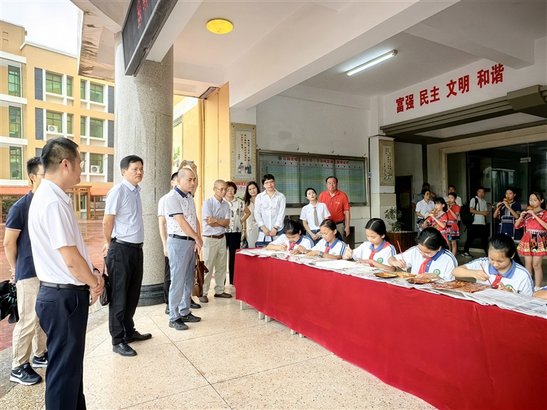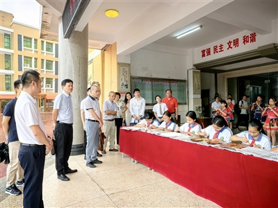 评估验收专家组一行实地参观华锦小学的微景观、学生作品展区、特色篮球操,以及该校葫芦丝社团带来的悦耳歌曲、石膏篆刻社团现场篆刻作品、生态园等;实地察看华锦小学建设情况,了解学校的办学理念、办学特色及校园文化;听取学校校长林水助以《润物细无声 温馨满校园》为题的“温馨校园”创建工作汇报。