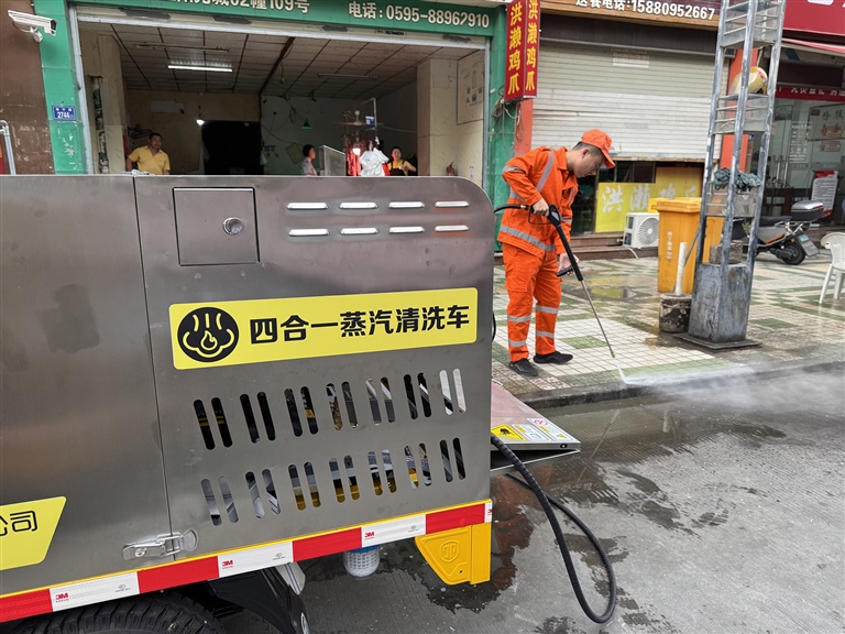 值得一提的是,此次新采购的29台小型高压清洗车和蒸汽清洗车将成为提升道路洁净度的关键力量。它们专攻长期困扰城市保洁的顽疾——道路油污、缝隙积土和垃圾桶周边污渍。长期以来,在不少夜市、餐饮街区、流动摊点以及垃圾桶周边等区域,产生的油污渗入路面缝隙,与尘土结合形成黑色结块,传统“水冲洗+人工刷”方式难以根除。今年7月,石狮龙马在后花社区试点使用蒸汽清洗车,对长期被油污覆盖的路面进行深度清理。160℃高温蒸汽快速分解油脂,配合高压喷射,仅用一小时便还原50平方米灰白色路面,效率较传统方式提升一倍。