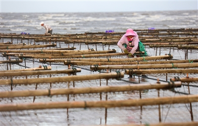 台风“桦加沙”逼近 紫菜农加固紫菜架