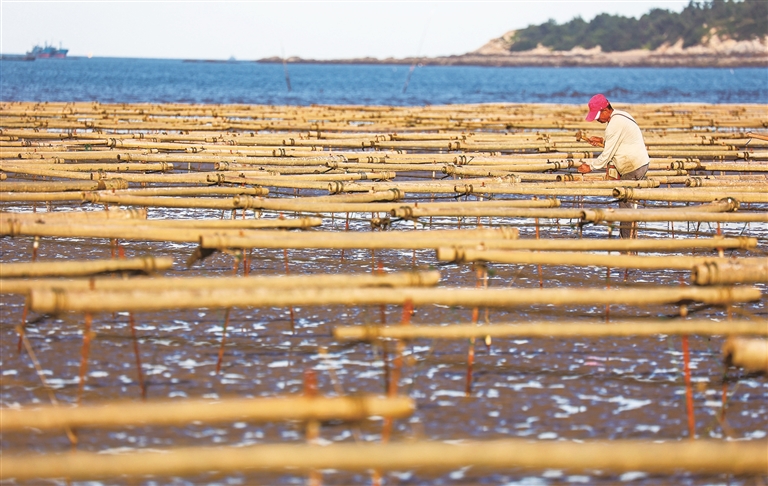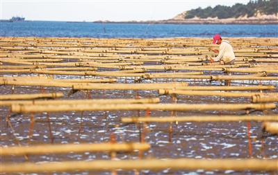 白露前后是紫菜泼苗的时节,近日,记者在祥芝古浮湾海区看到,紫菜养殖户们利用退潮间隙,对紫菜架进行加固和刮苔作业,为紫菜泼苗做好准备。(记者 颜华杰)