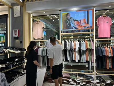 “国庆中秋假期将至,户外出行正当时!店里已经备好充足货源,T恤衫、休闲夹克、休闲裤及商务休闲上衣系列可以全方位满足市民、游客的购衣需求。目前店内潮流轻薄款外套、皮绒夹克、轻薄羽绒服、宽松上衣都比较畅销。”服装城北B男装交易区名仕蒙可男装总经理陈海说。