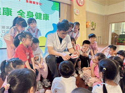 本报讯 9月19日,湖滨社区卫生服务中心组织牙科医务人员走进湖滨中心幼儿园,为大班段全体师生开展“全国爱牙日”主题宣讲活动,通过趣味互动,用孩子们听得懂、喜欢玩的方式,播撒口腔健康的种子。