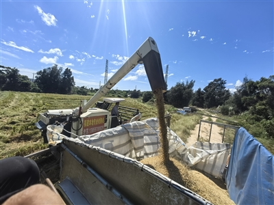 当日上午,记者在东园村村委会附近看到,眼前一片约20亩稻田里,市农业农村局、鸿山镇及东园村负责人正共同查看旱稻成熟情况,并划定验收区域。随着收割机轰鸣启动,金黄的旱稻被迅速收割进仓,现场洋溢着丰收的喜悦。“旱稻长势良好,稻穗饱满,待称重后估算每亩产量,以检验此次撂荒地改造成效。”现场工作人员表示。