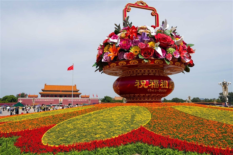 9月25日,2025年“祝福祖国”巨型花篮正式完工,亮相天安门广场与市民共度佳节。今年“祝福祖国”花坛以喜庆的花篮为主景,花坛顶高18米,篮体高16米,篮盘直径12米。篮体南侧书写“祝福祖国”“1949—2025”字样,篮体北侧书写“欢度国庆”“1949—2025”字样。篮内选取了美好寓意的花卉,其中荷花寓意“和和美美”、橄榄枝寓意“荣耀和平”等,还结合和平鸽元素,体现“和平发展、欣欣向荣”。(新华)