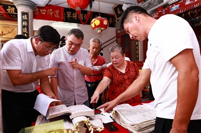 洪传翔和母亲在水头洪氏宗祠认真查阅、核对族谱