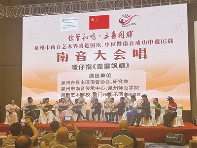 本报讯 9月28日下午,“弦管和鸣·三喜同辉”——泉州市南音艺术界喜迎国庆、中秋暨南音成功申遗16载大会唱活动在石狮举行。泉州市文联主席、一级调研员夏丽清,中国艺术研究院音乐研究所所长李宏锋,泉州市文联专职副主席潘向前等领导、嘉宾出席活动。