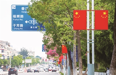 国庆佳节,我市大街小巷被“中国红”装点一新,处处洋溢着喜庆祥和的节日氛围。9月30日,记者在八七路、濠江路等地看到,一面面鲜艳的五星红旗整齐悬挂于灯杆上,形成一道道亮丽的风景线。(记者 颜华杰)