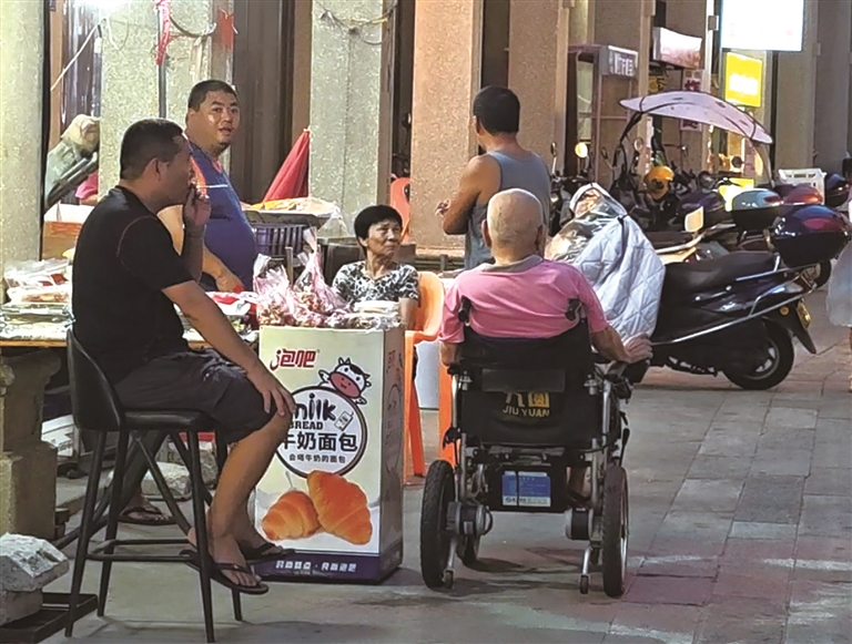 国庆节假期,在热闹的八卦街夜市里,笔者有一个小小的发现,觉得颇值得一提,那便是,“轮椅族”也来逛八卦街了:在一处摊位前,一位开电动轮椅的老人停下来与老街坊攀谈;不远处,一位开电动轮椅的中年妇女独自悠闲地逛着;在庙前广场,一位年轻的电动轮椅使用者在认真观看民俗文化表演……