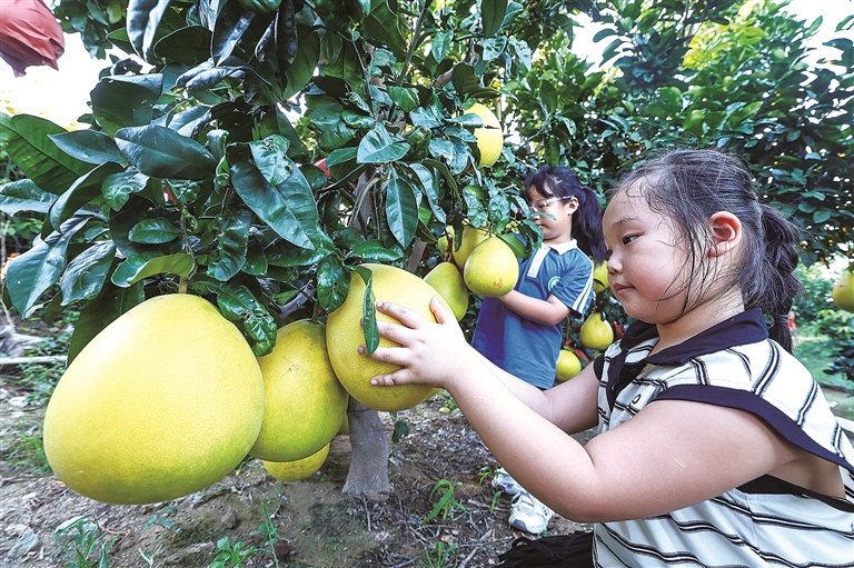 本报讯 金秋时节,柚果盈枝。日前,记者走进位于石狮湿地公园的一处三红蜜柚种植园看到,成片的柚子林郁郁葱葱,一个个沉甸甸的柚子宛如黄灯笼挂满枝头。果园里,柚农引导前来采摘的市民撕开柚果套袋,从枝头将柚子摘下,装入袋中。据种植户介绍,今年的柚子产量创下新高,每棵柚树挂果30个左右,亩产达3000斤。