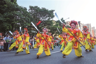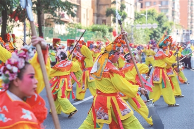 10月5日,石狮八卦街锣鼓喧天。泉州闽南文化戏剧周系列活动携升级版“宋江阵”惊艳亮相,以“固定点展示+行进式互动”打破传统舞台边界。108名演员化身“簪花侠士”,将闽南簪花的柔美与水浒英雄的豪气交融,引得游客蜂拥追逐,镜头与喝彩声交织,再现“棍棒手扑,妙绝天下”的民俗奇观。