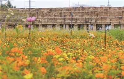 穿过渡槽入口的石砌门洞,这片硫黄菊田便铺展在眼前。细长的花茎托起层层叠叠的花瓣,从浅黄到明黄的色彩渐变如同打翻了调色盘,在秋风中轻轻摇曳,偶有蜜蜂穿梭其间,为静谧的田园增添了灵动气息。花海周边,水车、稻草人小品点缀其间,远处的红砖大厝与番仔楼错落排布,锈石墙体在花海映衬下更显岁月韵味。