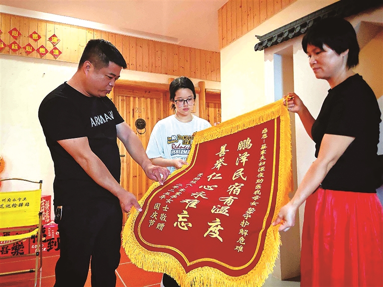 本报讯 “鹏泽民宿有温度 善举仁心永难忘”!10月14日,位于祥芝镇东大垵的“鹏泽海品民宿”收到一份特殊的快递——一面来自广东梅州的锦旗。“我和爱人只是尽了咱们石狮人的本分。”民宿负责人蔡鹏泽向记者表示。
