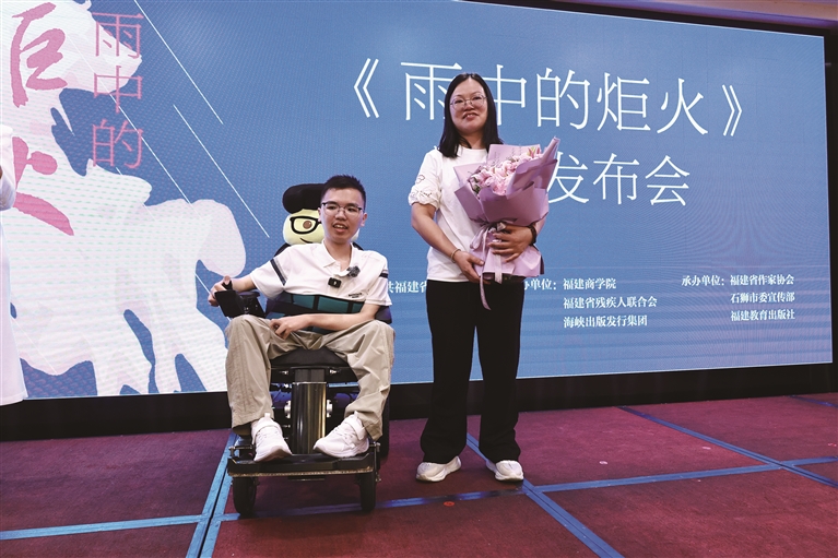 从学校的学术报告厅,到市里的文化馆音乐厅,再到如今省里的福建会堂,吴承谕的三本新书发布会,见证着吴承谕从稚嫩到成熟的蜕变过程,亦凝聚着社会各界对吴承谕这一罕见病患者无条件的支持与爱护。这份贯穿始终的温暖,恰是《雨中的炬火》创作的初心。正如发布会最后,吴承谕在介绍《雨中的炬火》创作情况时中所说:“‘雨中’的并不止我一人,我们每个人,都可能面对着自己生命中那场瓢泼大雨,经历着各自截然不同的艰难。而‘炬火’,就是这冰冷雨中最珍贵的温暖。这炬火,来自于每一位向我伸出过援手的人——是你们,即便自己身在雨中,也愿意为我撑一把伞,点一盏灯,用你们的关怀与爱,温暖了我。”