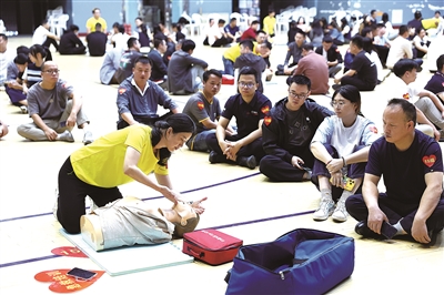 “常见的四类紧急情况,包括大出血、气道阻塞、心跳停止、呼吸停止……”“心肺复苏中,胸外按压30次、人工呼吸2次为一组,要连续操作5组……”“拿到AED要马上启用,开机后电极片一片贴右胸锁骨下、一片贴左胸外侧,根据提示除颤后,继续实施心肺复苏。”培训中,陈荣明从急救的重要性和四类紧急状况的表征说起,为参训队员们系统讲解并演示心肺复苏和海姆立克的科学操作步骤、AED的规范使用方法、急救过程中的注意事项和自我防护等。随后,在志愿者教员的指导下,队员们分组模拟实操、学习要领。