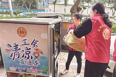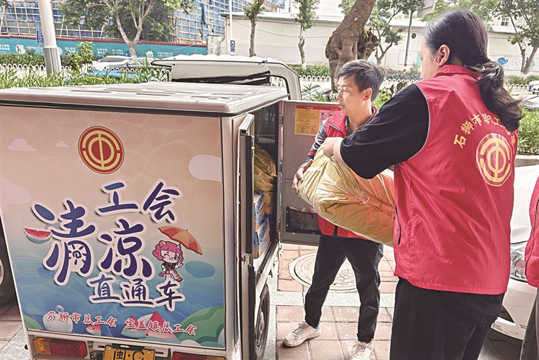 “天气热,大家快来喝瓶水歇一歇!”在我市圆通速递网点,工会干部顶着烈日,将矿泉水、防暑药品等物资送到快递员手中,接过清凉物资,快递员们的脸上露出了欣慰的笑容。七八月份,我市高温天气持续,石狮市总工会构建的“送清凉”立体服务体系,为一线职工撑起了一把坚实的“防晒伞”。