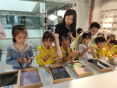 活动中,在研学实践基地老师的带领下,小朋友们跟着“纤维去旅行”,走进纺织产业科普馆、纺织功能科技馆等空间,通过听取讲解和互动体验,了解一件衣服从纤维、纱线、面料(印染)、辅料到成衣的生产流程。随后,大家走进纺织工坊,在老师和家长的指导下,学习扎结、染色,沉浸式感受扎染这一传统工艺美术的魅力。