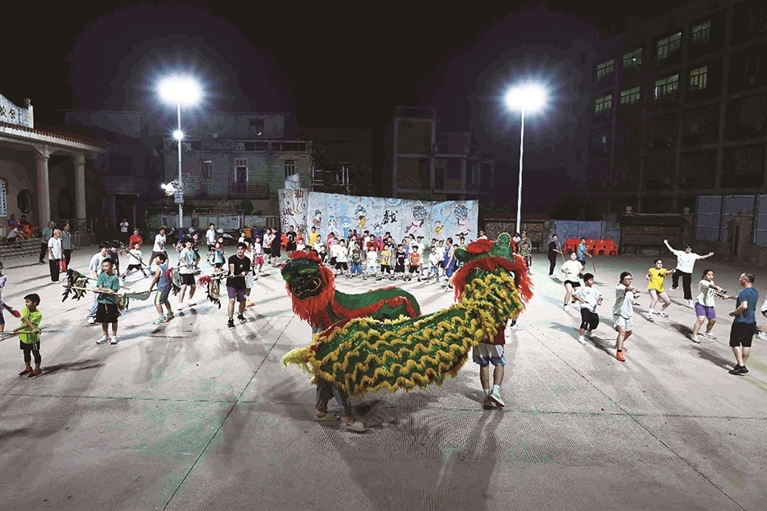 从校园操场到暑期集训,狮阵走进孩子的生活。在石狮市锦尚镇第二中心幼儿园的操场上,经常能看到幼儿手持狮头,随着鼓点变换阵形,动作如行云流水,令人惊叹。这些“小武师”的教练,正是来自卢厝狮阵武术馆的老师傅们。每年暑假,卢厝、东园、沙美等村都会组织中小学生参加狮阵集训。从傍晚到夜幕降临,训练场上的老师傅们一招一式倾囊相授。让孩子们参与狮阵培训,不仅是为了锻炼身体,更是为了让他们从小接受家乡文化的熏陶,感受祖辈传承下来的尚武精神与集体意识。
