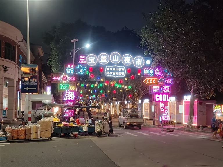 本报讯 10月30日晚,位于永宁镇西偏村旅游商品一条街的宝盖山夜市正式开市。150米长的街道流光溢彩,65辆统一风格的摊点车整齐排布,特色美食、驻唱表演与打卡景观相映成趣,为游客打造了一场兼具烟火气与乡村韵味的夜间消费盛宴。