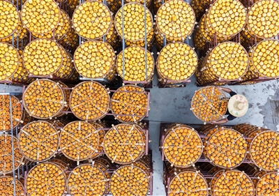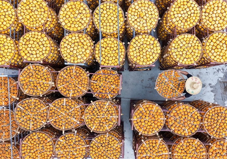 11月1日,广西桂林市平乐县二塘镇牛角村村民在晾晒柿子(无人机照片)。深秋时节,各地农民抢抓农时加紧收获,处处是喜人的秋日好“丰”景。(新华)