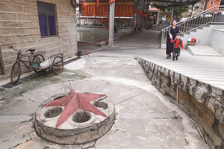 走到港塘村的篮球场旁,目光总会被那口五角星井所牵引,水泥与石块砌成的圆形井台中央,一颗鲜红的五角星虽被风雨磨得有些斑驳,却仍明亮得像当年刻下时的模样。五角星的五个角间,均匀分布着五个圆形汲水口,井口边缘的浅凹痕,是一辈辈村民弯腰提桶留下的印记。