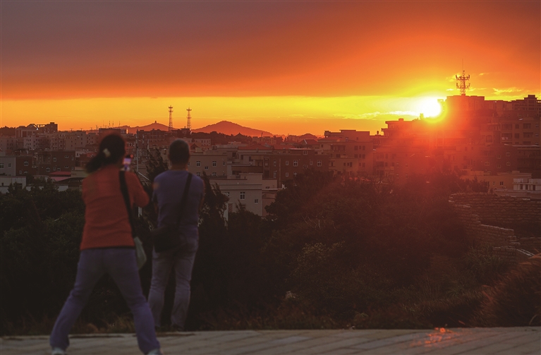 昨日傍晚时分,在祥芝灯塔公园,夕阳缓缓下沉,先是将天际线染出一片炽烈的橘红,继而层层叠叠的霞光映照在祥芝渔港和楼宇间,远处姑嫂塔被霞光拥裹着静静伫立。奇妙的山海光影吸引市民与游客驻足欣赏,或用手机记录光影瞬间,或倚靠在观景设施旁静静观赏,在暮色中邂逅独属于石狮海滨的浪漫景色。(记者 颜华杰)