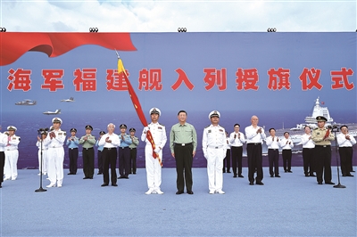 下午4时30分许,入列授旗仪式开始,全场高唱中华人民共和国国歌,五星红旗冉冉升起。仪仗礼兵护卫着八一军旗,正步行进到主席台前。习近平将八一军旗授予福建舰舰长、政治委员。福建舰舰长、政治委员向习近平敬礼,从习近平手中接过八一军旗。习近平同他们合影留念。入列授旗仪式在中国人民解放军军歌声中结束。