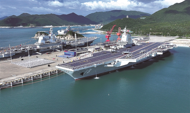 十一月的三亚,海阔天高,碧波浩瀚。军港内,福建舰踏海而立、满旗高悬,山东舰伏波相伴,来自海军部队和航母建设单位的代表2000余人在码头整齐列队,气氛隆重热烈。