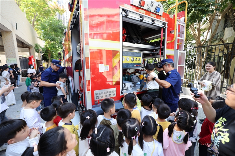 最受孩子们欢迎的当属趣味互动环节。消防宣讲员通过“消防安全知识抢答”的形式,抛出“火警电话是多少”“小朋友能不能玩打火机”等问题,孩子们踊跃举手、积极抢答,在欢乐的氛围中巩固了消防安全知识。更令人兴奋的是“穿消防服比赛”“抢帽子”等互动小游戏,孩子们与消防员叔叔欢乐互动,现场欢声笑语不断。活动最后,消防员带着萌娃们参观消防车辆,近距离感受消防车的魅力。