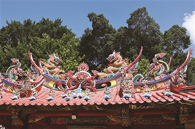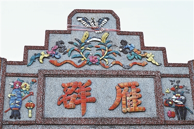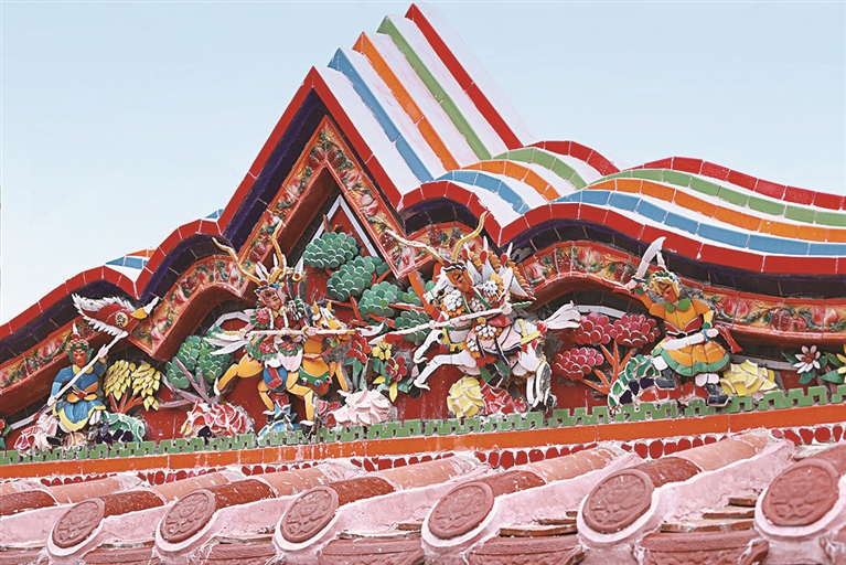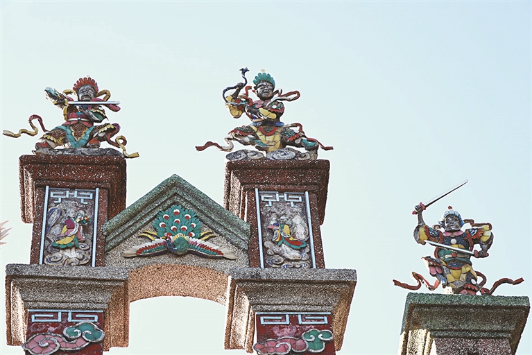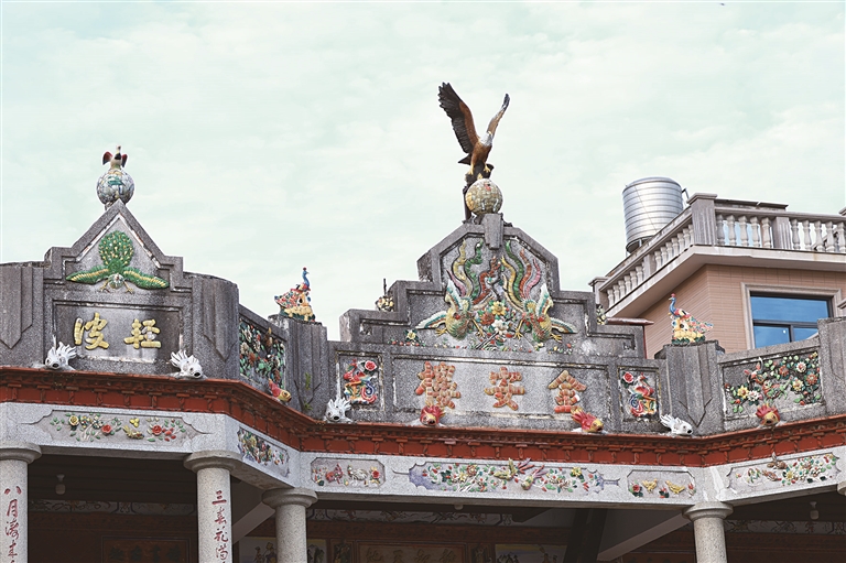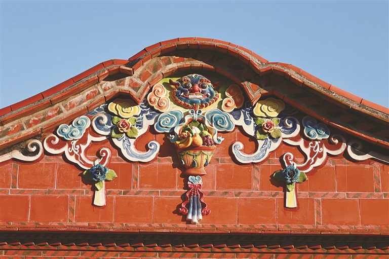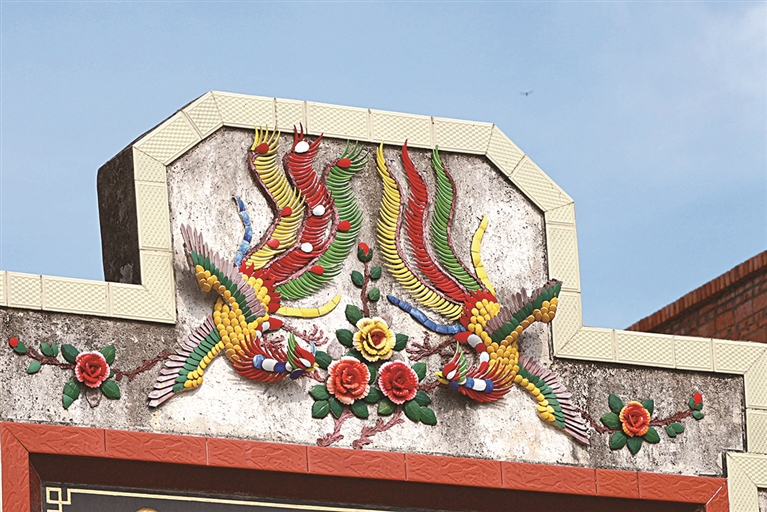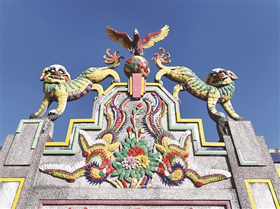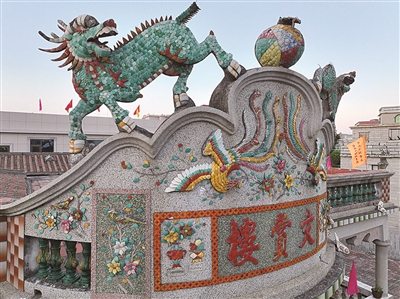 “剪黏是以彩色瓷片为主要材料的传统建筑装饰工艺,通过剪裁、敲磨瓷片等手法,形成的浮雕式立体装饰。该工艺发源于闽南地区,宋明时期逐渐成熟,广泛应用于寺庙、宫观、宗祠等建筑的屋脊、檐角、照壁等部位,题材涵盖祥瑞纹样、戏剧人物等。”市文化馆有关人员介绍,碎瓷是剪黏的骨。旧时匠人手执铁剪,将废弃的碗盘裁作鳞羽、花瓣、眉眼,釉色的浓淡被拿捏得恰到好处:如在梅林村文赏楼上,青碗片叠成麒麟的身形与脊背,红瓷块剪作丹凤的冠羽与凤尾;杨孙西文化馆的山墙,兽头花果篮的瓷块承载着闽南人对美好生活的向往;仑后村光明楼的尾脊一侧,五彩斑斓的瓷块化作戏曲人物的远征……本应湮灭在烟火里的瓷片,在檐角获得了新生——暴雨淋不透它的艳色,海风蚀不掉它的轮廓,哪怕历经数十年,麒麟的鳞甲仍如初嵌时般明丽,恰似石狮人刻在骨血里的坚韧与热烈,也是那句“爱拼敢赢”的真实写照。