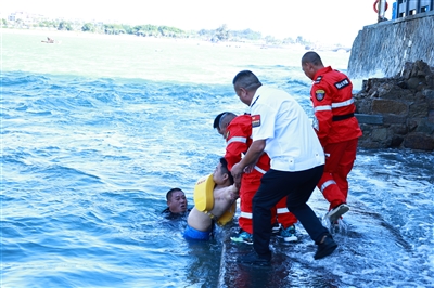 海上救生演练率先拉开帷幕。随着指挥员“海上有人溺水”的应急救援口令下达,救援队员凭借专业技能快速向“溺水者”方向游去,成功将其救到岸边,并熟练实施心肺复苏等急救措施。经过紧急处理后,“溺水者”被迅速转运至120救护车,送往医院接受进一步“抢救”,整个救援流程紧张有序、衔接顺畅,充分展现救援队伍的专业素养。