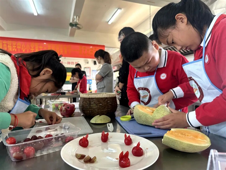 比赛中,四年级的水果拼盘创意赛与五、六年级的闽南小吃厨艺赛轮番登场。原本普通的水果在同学们的巧手下,变成了“前‘兔’似锦”“晨露果园”“甜蜜时光”等一个个主题鲜明、造型精美的拼盘;双皮奶、四果冰、杨枝甘露等闽南人喜欢的甜点在同学们的巧手制作下一一上桌。