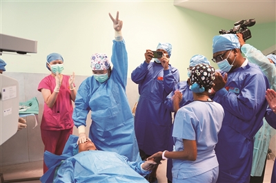 ▲11月7日,陈伟蓉教授为白内障患者瓦罗穆埃实施手术后,将手高高举过头顶,让患者辨认