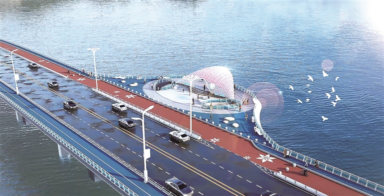 尤为亮眼的是,跨海大桥主桥南侧将配套建设一座用海面积1109平方米的观景平台,以“深海珍珠”为设计灵感,采用双层结构打造贝壳形状廊架,融入阶梯剧场与珍珠艺术装置,集赏景、休憩、文化展示于一体,流畅的曲线线条呼应海洋灵动之美,让游客置身其中便能感受深海的神秘与浪漫。