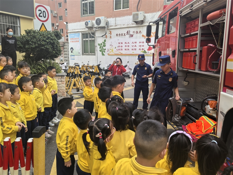 消防车开进幼儿园 萌娃体验“消防课”