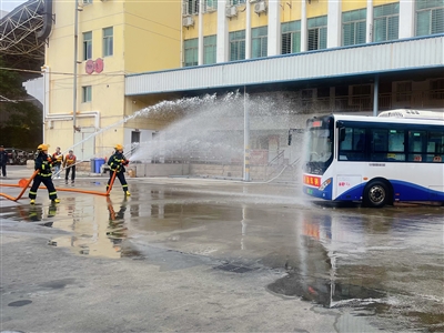 在演练中,模拟一辆停放在停车场的公交车突然发生自燃的紧急情况。驾驶员发现“险情”后,第一时间切断停车场电源,拨打119报警,并迅速跑到微型消防站,穿好防护服,对初期火情进行扑救。演练还模拟火势蔓延至其他车辆而引发更大“火情”的情况。在疏散引导员的指引下,楼内人员用湿毛巾捂住口鼻,弯腰低姿沿消防通道有序撤离。接警后,消防救援队迅速赶赴现场,立即展开火情侦察,根据现场情况部署作战方案,迅速设置水枪阵地,经过约15分钟的紧张处置,有效控制并扑灭火势。演练结束后,消防救援专家结合公交行业特点,就如何进一步优化应急预案、加强员工消防培训提出专业建议。