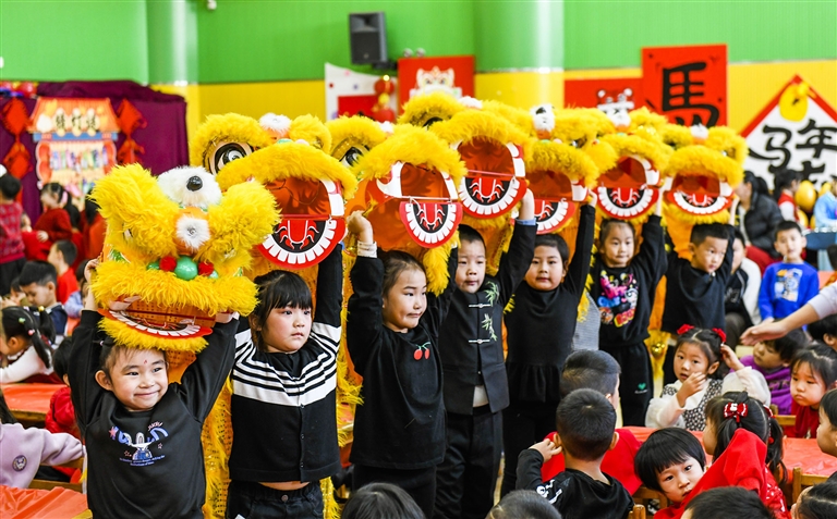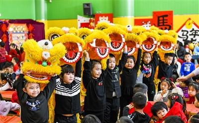 12月30日,河北省唐山市海港经济开发区第一幼儿园的小朋友在表演舞狮。元旦将至,全国多地学校和幼儿园举办丰富多彩的校园活动,让孩子们在快乐喜庆中迎接新年的到来。(新华)