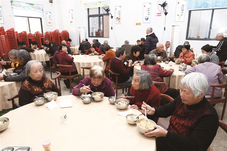 12月30日中午,鸿山镇伍堡村长者食堂迎来第365个开餐日,90多位老人围坐一堂,品尝热气腾腾的午餐,欢声笑语不断。