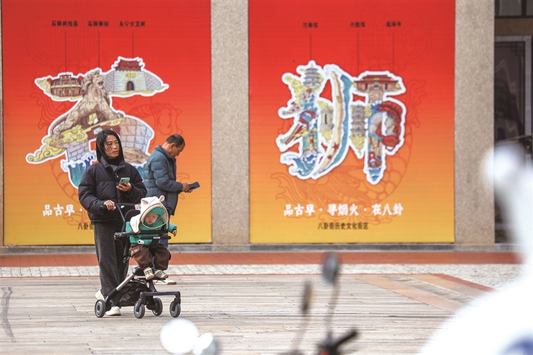 八卦街城隍庙广场,一位妈妈带着宝宝晒太阳(颜华杰/摄)