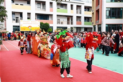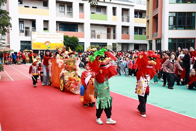现场年味与乡土气息交融。门厅展示着孩子们充满田园想象的绘画作品,洋溢着节日氛围;45辆花车巡游精彩上演,萌趣造型引得掌声不断;“蔬菜套圈”“母鸡下蛋”等十余项农耕主题游戏轮番登场。现场加油声、欢呼声此起彼伏。