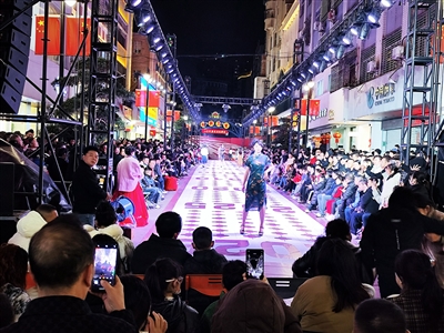 100米长的人民路秀场上,“时裳岁月”复古走秀动感开场。首场“风雅·旗韵”中,旗袍的盘扣流转着20世纪50年代的温婉,新中式男装的剪裁融合现代审美,芙蓉面发饰复刻时代风华,展现石狮服饰产业的传承脉络;随着Disco音乐响起,喇叭裤、波点裙、牛仔外套轮番登场,“潮涌·怀旧”专场瞬间将观众拉回20世纪90年代的石狮街头,重现“全国跑石狮”的商贸盛景。五交行商店、黄金楼的二楼阳台化作“穹檐漫歌”舞台,民谣乐队的弹唱与复古街景、璀璨灯光相融,流淌出石狮独有的“声音记忆”。沿街的逛吃市集里,特色小吃与手作好物、精选年货相映成趣。