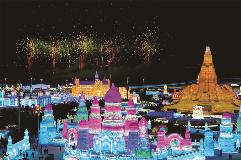 这是1月5日拍摄的哈尔滨冰雪大世界烟花秀(无人机照片)。1月5日,第42届中国·哈尔滨国际冰雪节在哈尔滨冰雪大世界启幕。作为中国首个以冰雪为主题的国际性节庆活动,哈尔滨国际冰雪节已走过41载春秋,是世界四大冬令盛典之一。(新华)