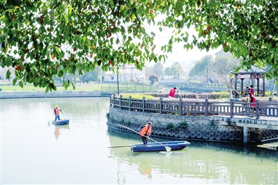 3月21日,长兴县和平镇长城村联合长岗村和回车岭村开展巡河护水行动,组织党员与群众共同参与水环境治理,迎接“世界水日”的到来。图为长城村党员志愿者正在打捞水面漂浮物。