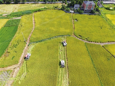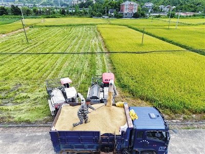 8月7日,建德市乾潭镇坌柏家庭农场组织农机手,开镰收割千亩高产高效示范田里栽种的“甬优4901”再生稻,头茬亩产量可达700公斤左右。再生稻是利用稻桩休眠芽再次萌发生长并最终形成稻穗的水稻种植模式,一般5月插秧后可在8月和10月收割两季,具有省种、省工、节水等特点,实现“一种两收”,提高亩均效益。 宁文武 摄