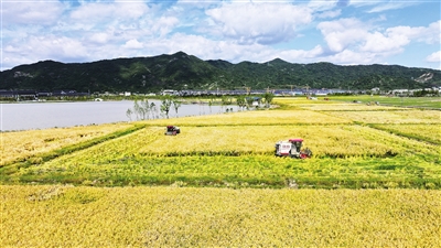 10月29日,在台州市路桥区桐屿街道,农机手驾驶收割机穿梭田间,忙着收割晚稻,确保颗粒归仓。